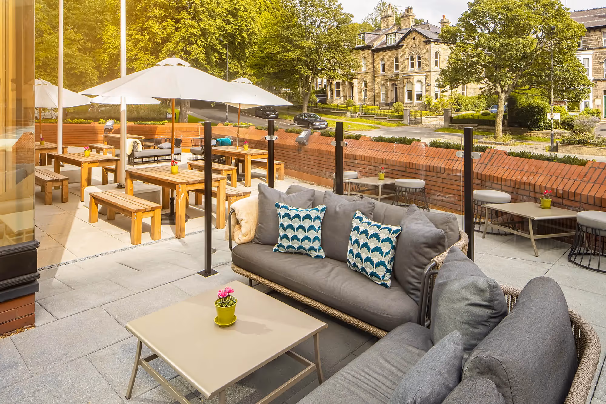 The hotel enjoys a central location within Harrogate, situated less than a ten-minute walk to train stations that have direct links to Leeds, York and London. The hotel is directly linked to the Harrogate International Convention Centre.